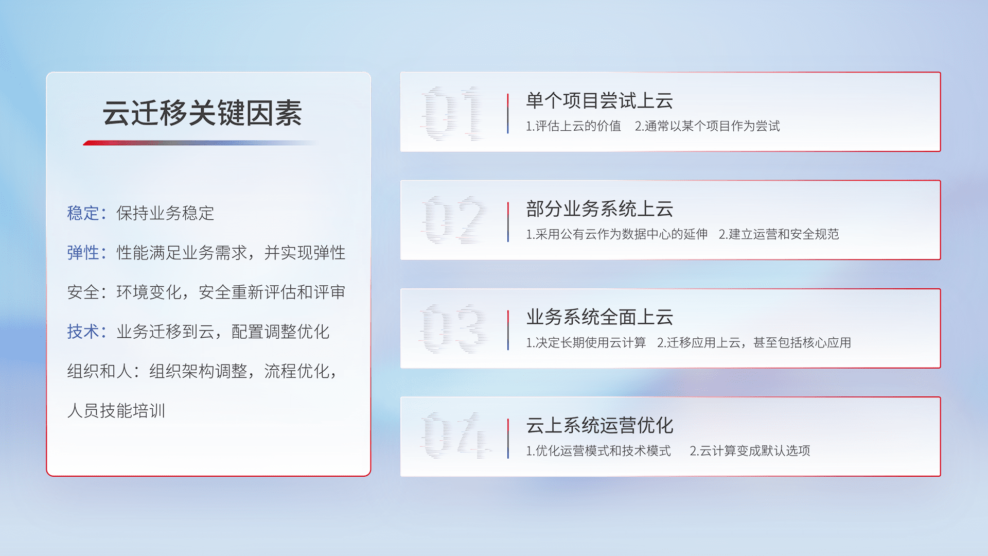 结合实际业务,,从规划设计、、云平台选型、、、、云原生改造、、、数据迁移、、集成交付,,,迁移全过程为客户识别最佳上云路径,,,,做好风险识别管理,,,设计网络架构、、、身份权限、、、安全审计合规、、操作审计、、日志审计、、监控告警策略、、、多站点容灾设计等,,,对云上基础设施进行整体规划,,,提升IT治理水平,,,,以满足弹性、、高可用、、高性能的需求。。