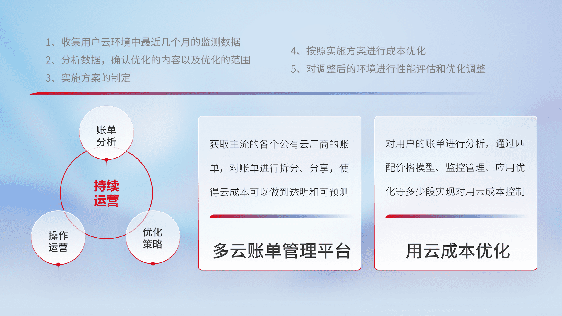 通过多云纳管,,,,以统一的资源数据模型把客户的云资源进行抽象和封装,,,进而实现对多云资源的统一操作,,保障云资源管理的可靠性、、、、稳定性与可用性。。量身定制化运维内容,,,,配置、、、、开发运维、、补丁管理、、、备份、、、、监控、、认证和访问管理、、审计和日常巡检等,,,保障在用云过程中的可靠度,,稳定度以及高可用率。。