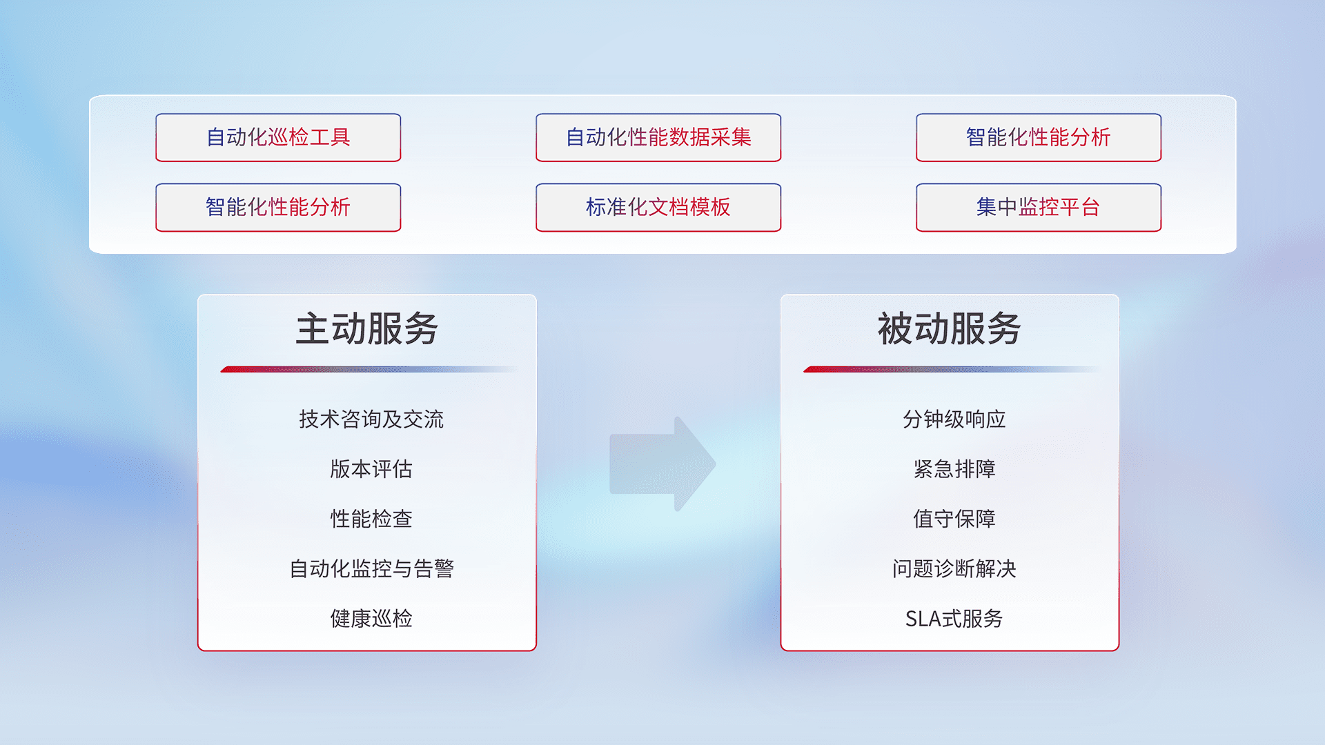 智能化工具和标准化文档,,,,保障服务质量,,,,提供主动服务(包含技术咨询、、版本评估、、、、性能检查、、、自动化监控与告警、、健康巡检)和被动服务包含(分钟级响应、、、、紧急排障、、、值守保障、、问题诊断解决、、SLA服务)。。。。